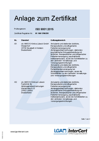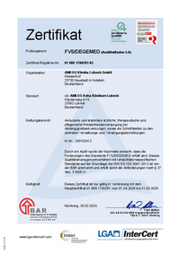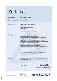 Zertifikat Prüfungsnorm ISO 9001:2015 Zertifikat-Registrier-Nr. 01 100 1700281 Unternehmen: AMEOS Klinika Lübeck GmbH Wiesenhof 23730 Neustadt in Holstein Deutschland mit den Standorten gemäß…
