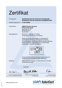 Zertifikat von der Deutschen Schlaganfall-Gesellschaft und der LGA InterCert Zertifizierungsgesellschaft mbH für die Stroke Unit am AMEOS Klinikum Bernburg vom 14.06.2024